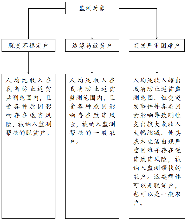 防止返贫监测对象(以下简称“监测对象”)是指面向所有农村地区、所有农村户籍人口,以当年当地监测范围指导线为参考标准(2024年全省年人均纯收入为8000元),综合考虑“三保障”和饮水安全,以及因病因灾因意外事故等其他各种原因导致基本生活出现严重困难情况,将存在返贫致贫风险,且依靠自身能力难以解决困难的农户,通过履行识别程序认定为监测对象,实施帮扶措施。