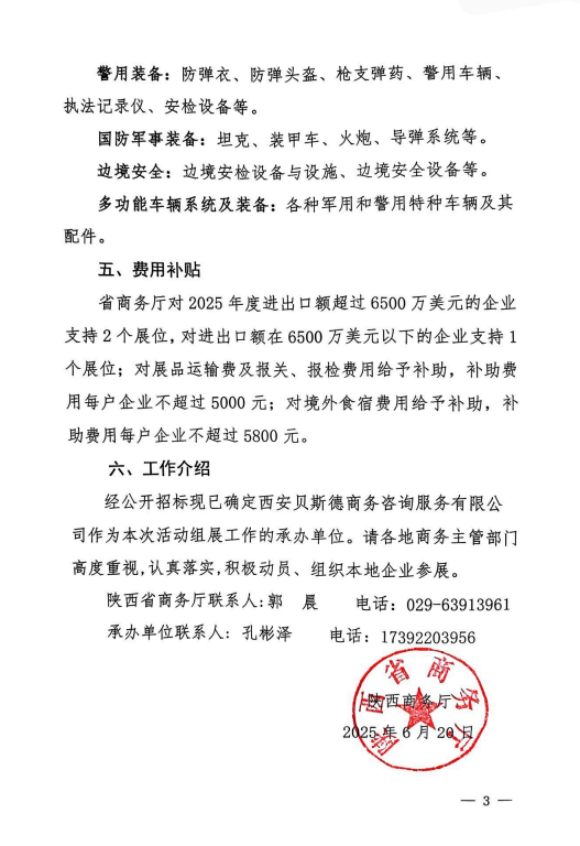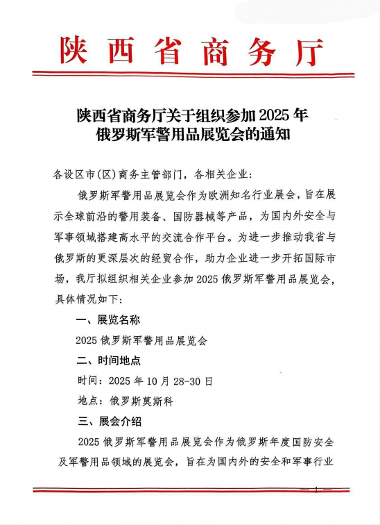 陕西省商务厅关于组织参加2025年俄罗斯军警用品展览会的通知