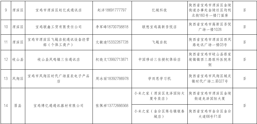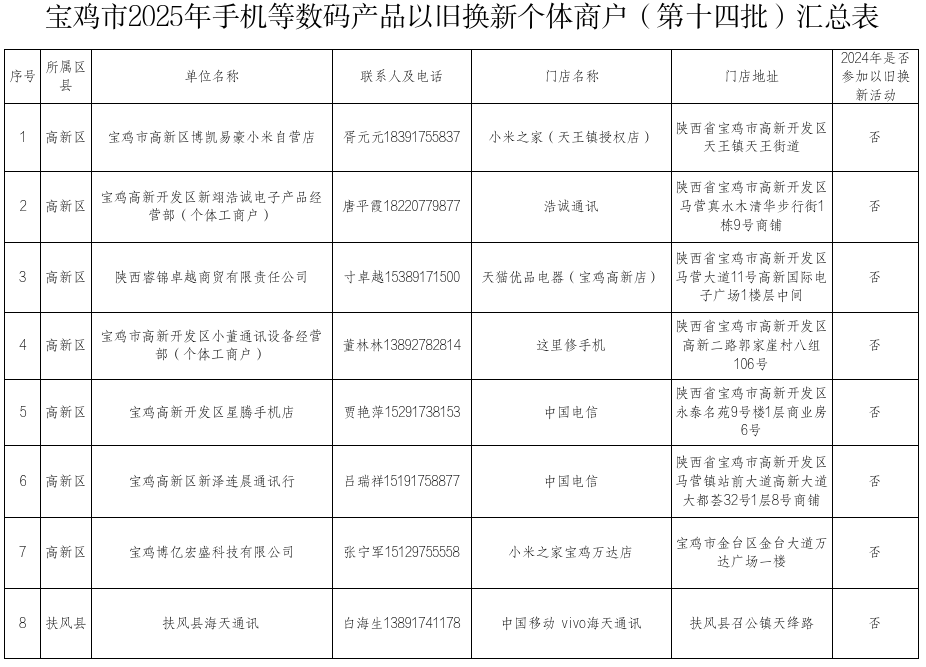 为接续做好消费品以旧换新工作,确保宝鸡市加力扩围实施消费品以旧换新工作顺利实施,经过发布通知、宣传动员、自主申报、县区审核、社会公示等程序,现将确定手机等数码产品以旧换新参与企业及个体商户(第十四批)有关信息予以公告。