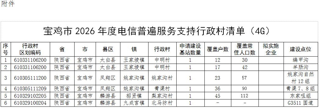 附件:宝鸡市2026年度电信普遍服务支持行政村基站清单