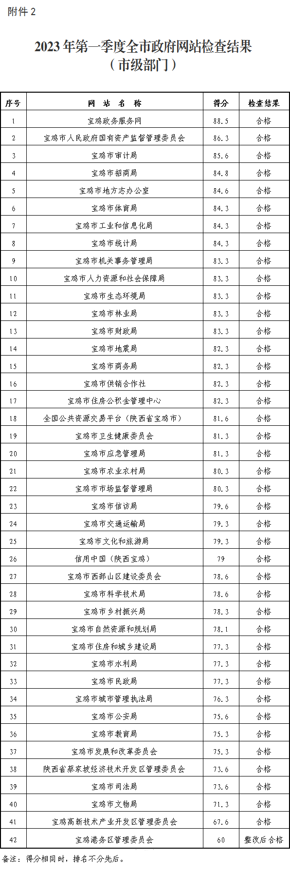 按照《宝鸡市政府网站管理办法的通知》(宝政办发〔2021〕23号)要求,近期,市数字经济局会同第三方机构,组织开展了2023年第一季度全市政府网站监测检查,结合省政府办公厅政务公开办2022年度政务公开工作绩效评估报告反馈意见,现将有关情况通报如下。