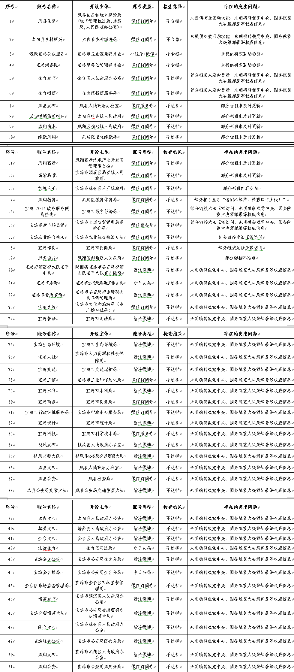 (五)存在漏报的政务新媒体账号。市公安局开通的“宝鸡网警”新浪微博、今日头条、抖音短视频、快手短视频、百家号、微信服务号和“宝鸡公安”视频号政务新媒体,未按程序申请报备和纳入平台监管,存在漏报现象。