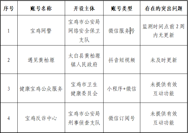 (二)个别单位未严格落实政务新媒体监管责任。宝鸡市交通警察管理支队“宝鸡交警”抖音短视频、宝鸡市市场监督管理局“宝鸡市市场监管”今日头条开设主体名称与“全国政务新媒体信息报送系统”所填报的开设主体名称不一致,宝鸡市市场监督管理局“宝鸡市场监管”新浪微博点赞与本单位业务无关的信息,凤翔区发展和改革局“凤翔发改”,凤翔区柳林镇人民政府“醉美柳林”开设主体未使用规范全称。