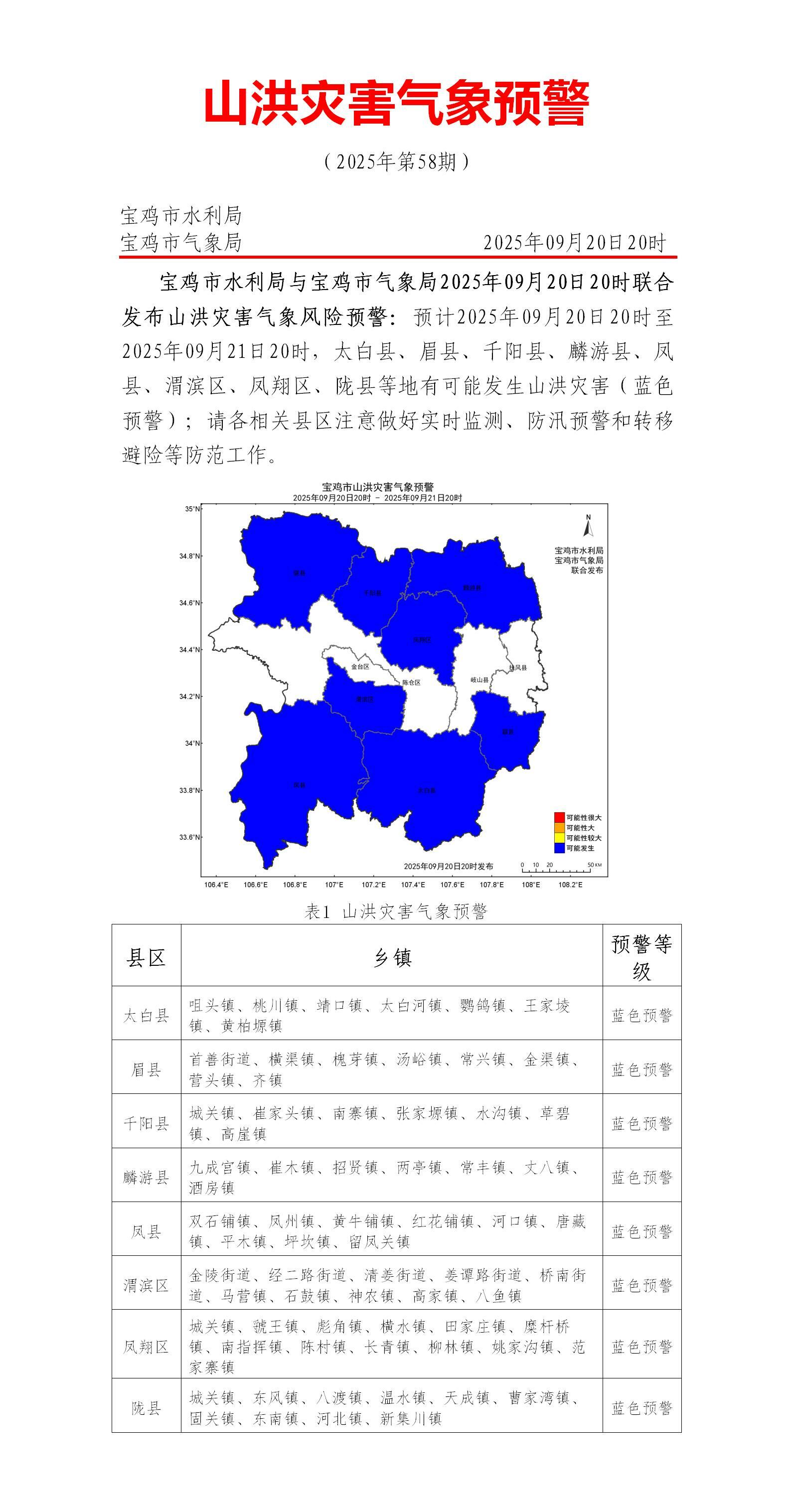 【宝鸡市气象局】宝鸡市水利局与宝鸡市气象局2025年09月20日20时联合发布山洪灾害气象风险预警:预计2025年09月20日20时至2025年09月21日20时,太白县、眉县、千阳县、麟游县、凤县、渭滨区、凤翔区、陇县等地有可能发生山洪灾害(蓝色预警);请各相关县区注意做好实时监测、防汛预警和转移避险等防范工作。