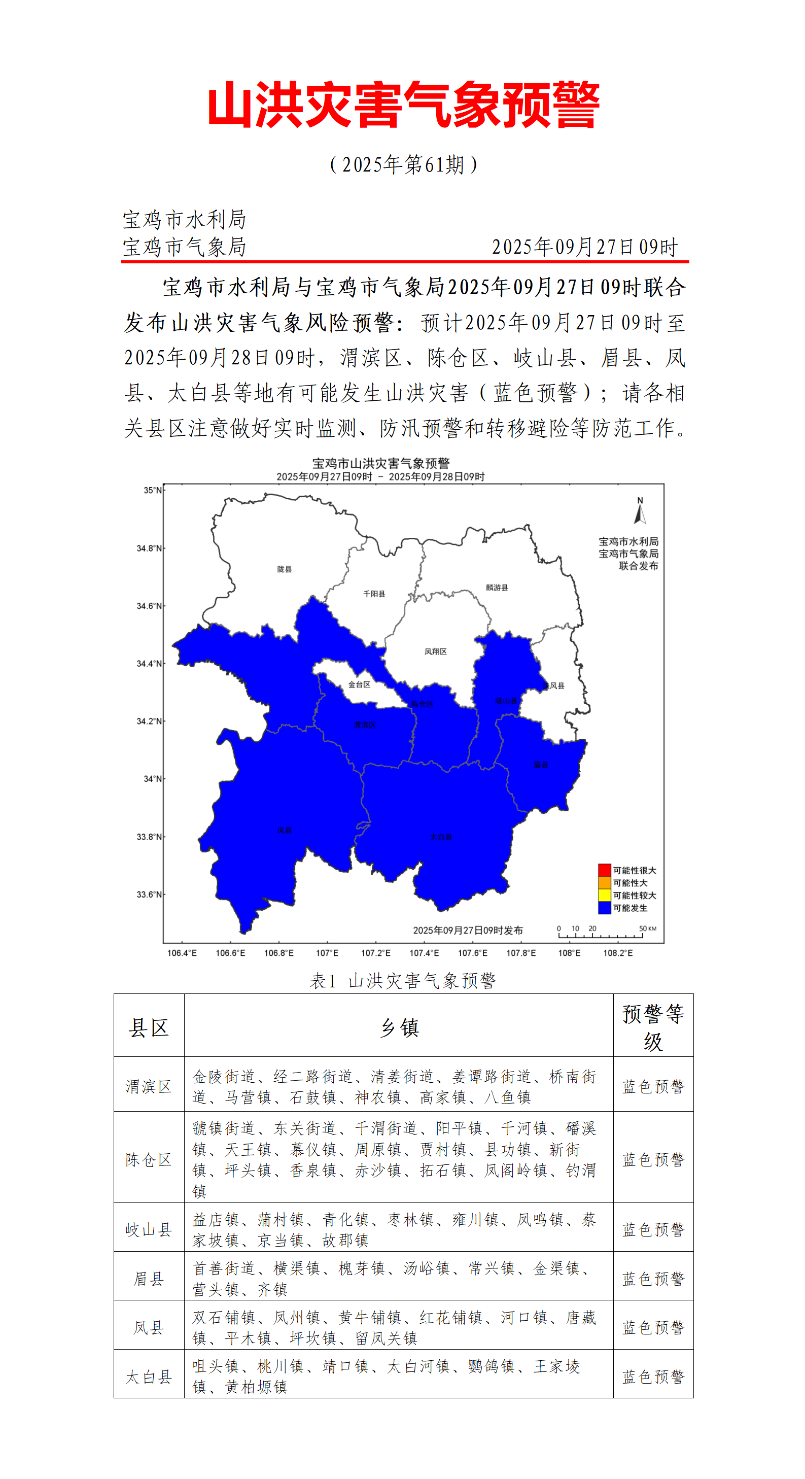 【宝鸡市气象局】宝鸡市水利局与宝鸡市气象局2025年09月27日09时联合发布山洪灾害气象风险预警:预计2025年09月27日09时至2025年09月28日09时,渭滨区、陈仓区、岐山县、眉县、凤县、太白县等地有可能发生山洪灾害(蓝色预警);请各相关县区注意做好实时监测、防汛预警和转移避险等防范工作。