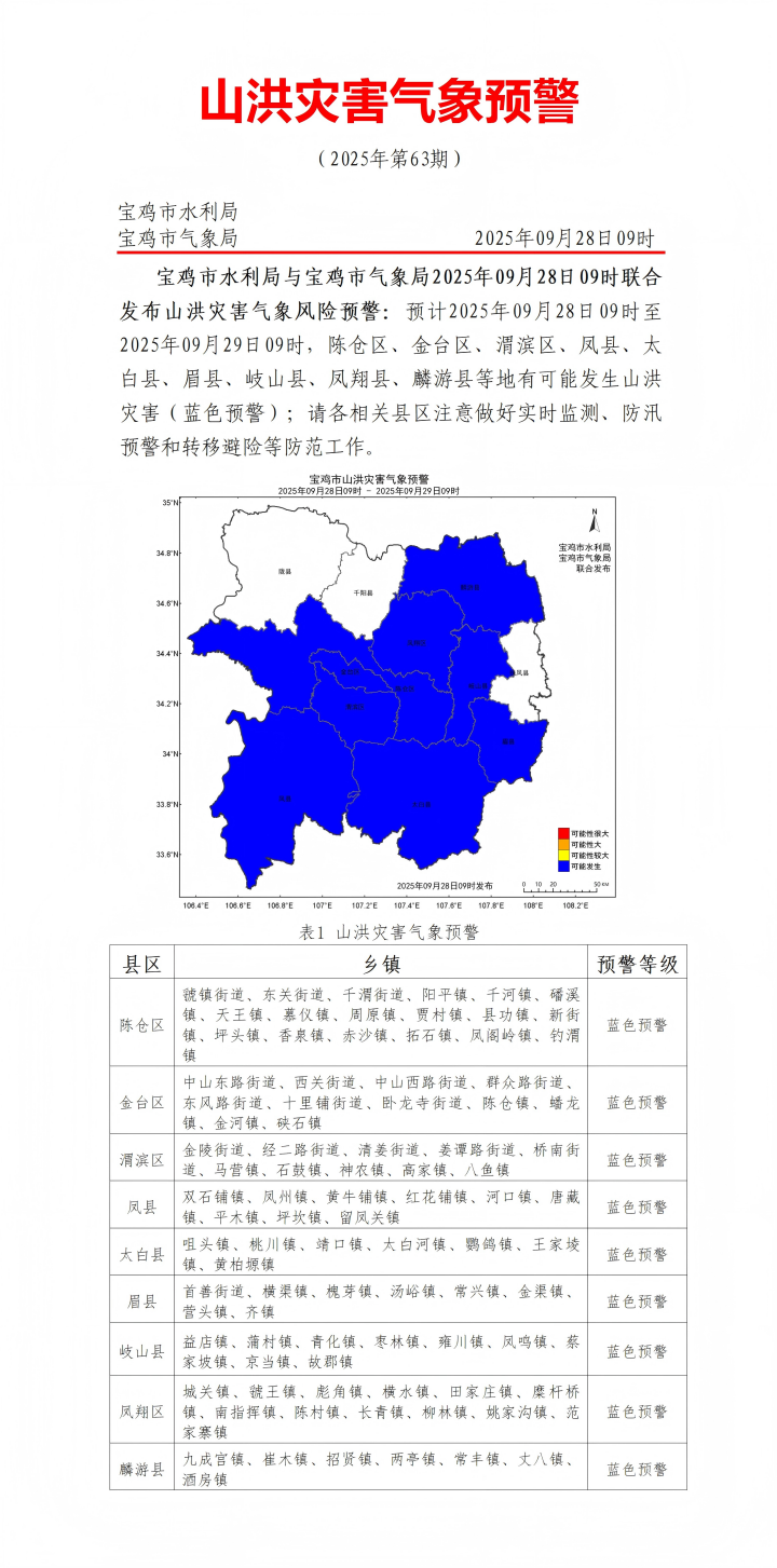 宝鸡市水利局与宝鸡市气象局2025年09月28日09时联合发布山洪灾害气象风险预警:预计2025年09月28日09时至2025年09月29日09时,陈仓区、金台区、渭滨区、凤县、太白县、眉县、岐山县、凤翔县、麟游县等地有可能发生山洪灾害(蓝色预警);请各相关县区注意做好实时监测、防汛预警和转移避险等防范工作。
