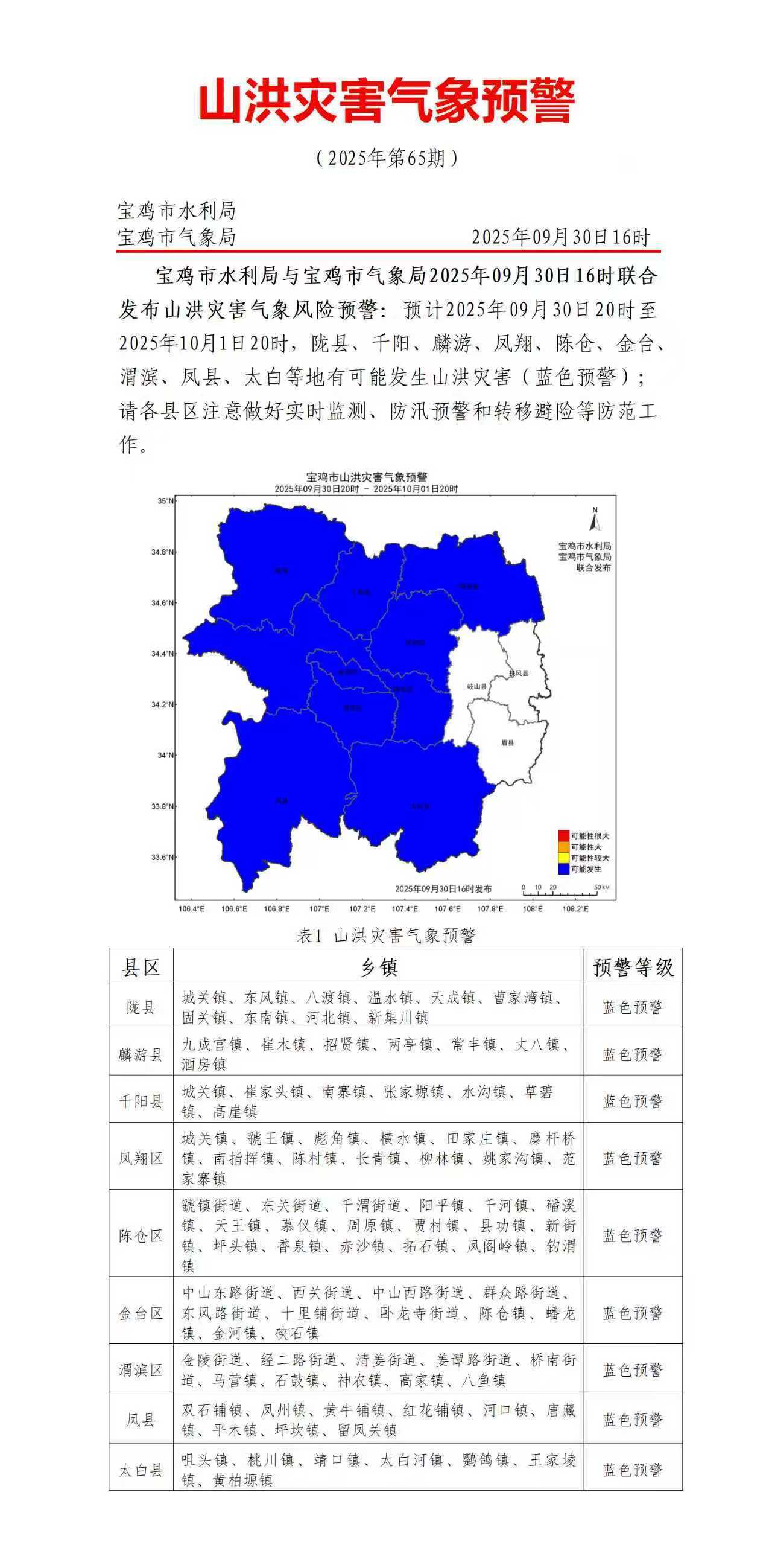 宝鸡市水利局2025年09月30日16时联合发布山洪灾害气象风险预警:预计2025年09月30日20时至2025年10月1日20时,陇县、千阳、麟游、凤翔、陈仓、金台、渭滨、凤县、太白等地有可能发生山洪灾害(蓝色预警);请各县区注意做好实时监测、防汛预警和转移避险等防范工作。