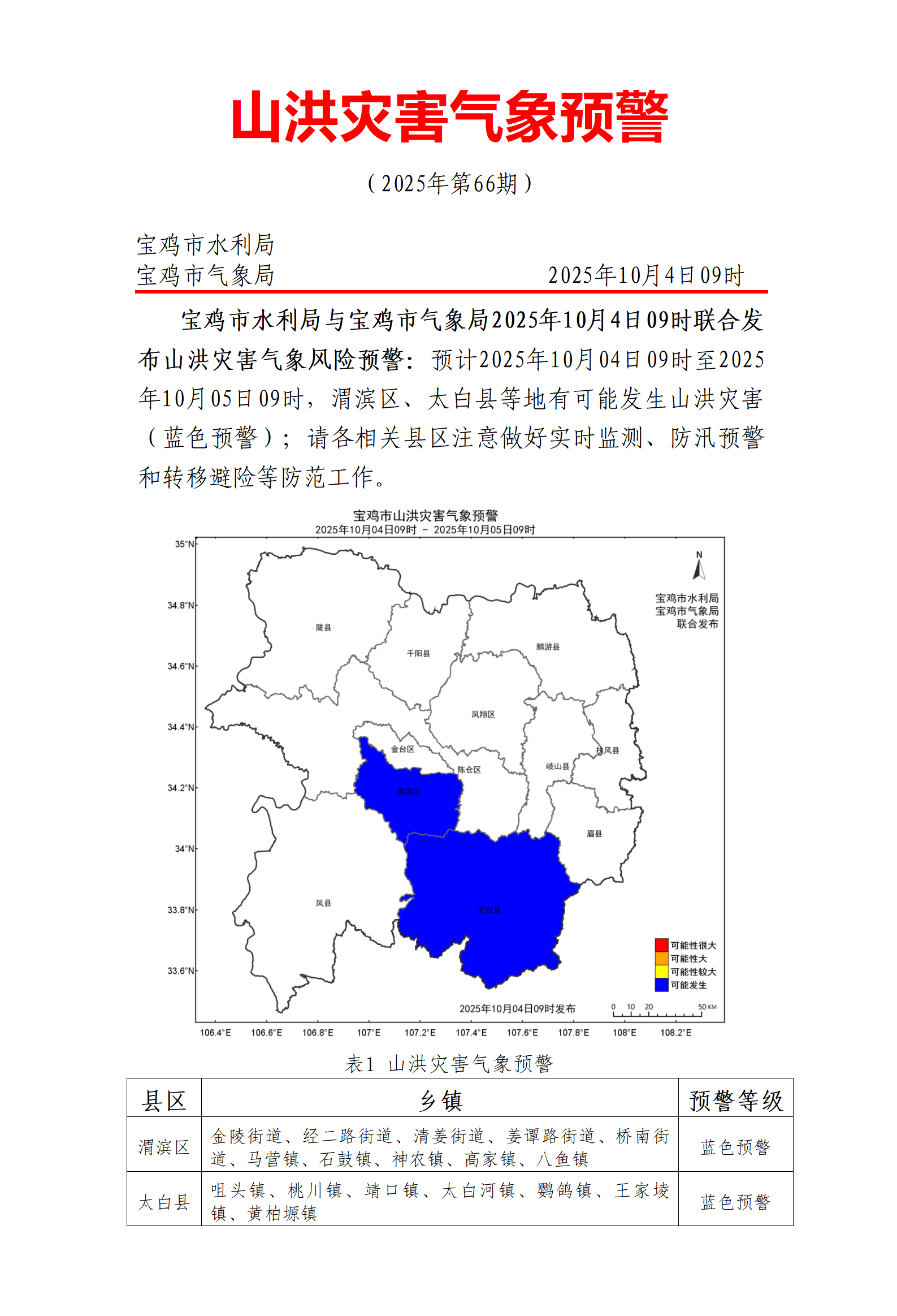【宝鸡市气象局】宝鸡市水利局与宝鸡市气象局2025年10月4日09时联合发布山洪灾害气象风险预警:预计2025年10月04日09时至2025年10月05日09时,渭滨区、太白县等地有可能发生山洪灾害(蓝色预警);请各相关县区注意做好实时监测、防汛预警和转移避险等防范工作。