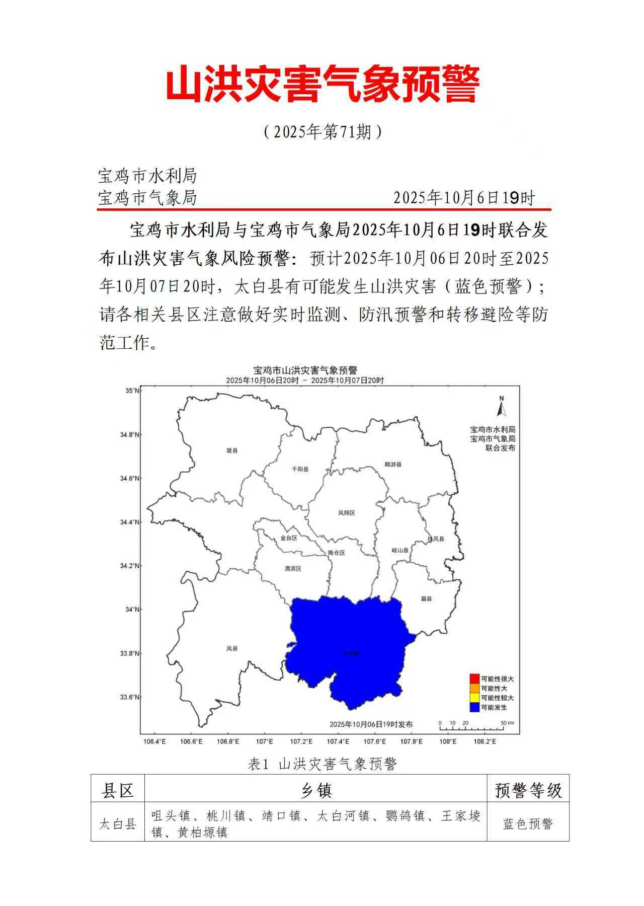 【宝鸡市气象局】宝鸡市水利局与宝鸡市气象局2025年10月6日19时联合发布山洪灾害气象风险预警:预计2025年10月06日20时至2025年10月07日20时,太白县有可能发生山洪灾害(蓝色预警);请各相关县区注意做好实时监测、防汛预警和转移避险等防范工作。