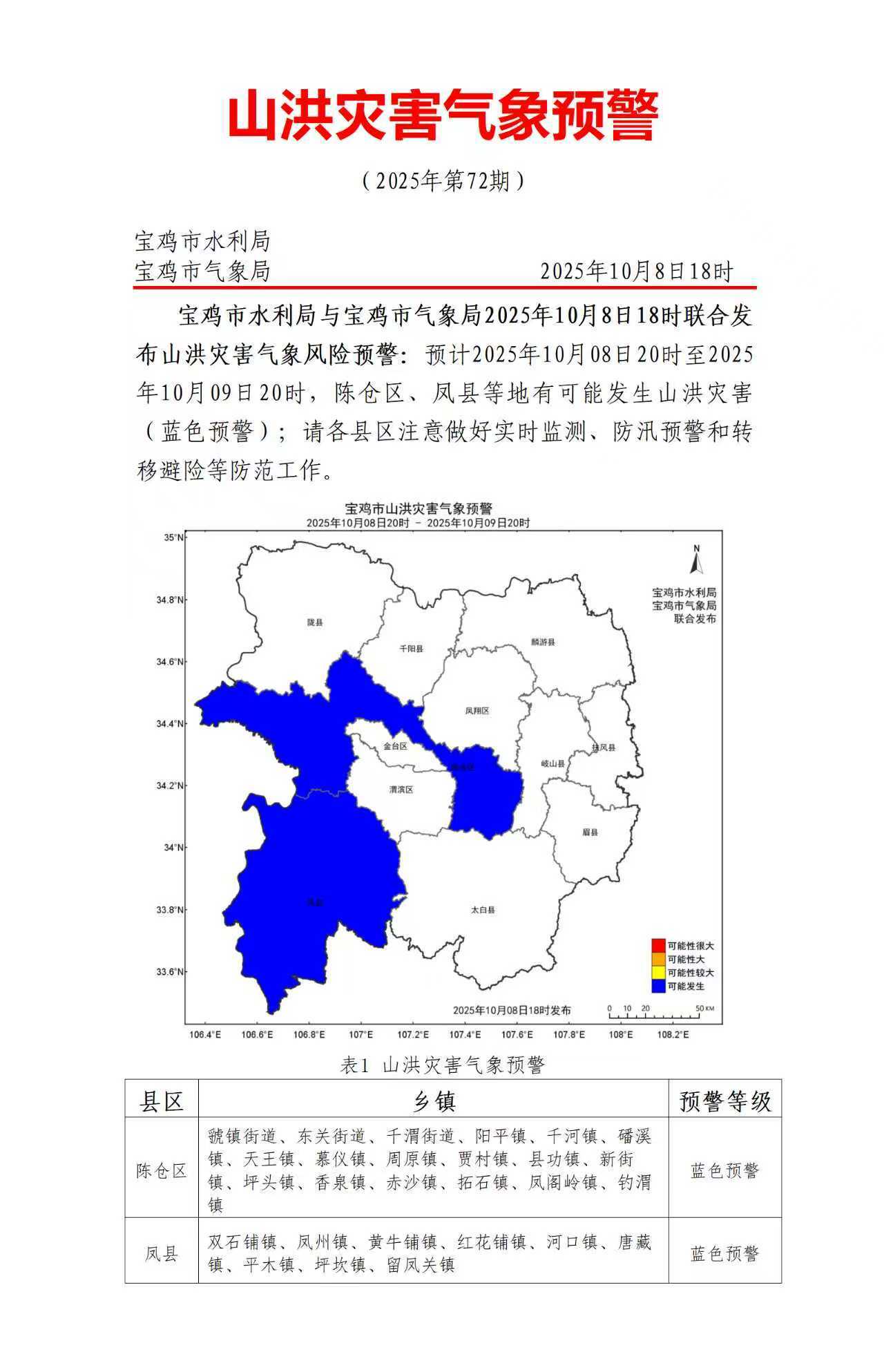 【宝鸡市气象局】宝鸡市水利局与宝鸡市气象局2025年10月8日18时联合发布山洪灾害气象风险预警:预计2025年10月08日20时至2025年10月09日20时,陈仓区、凤县等地有可能发生山洪灾害(蓝色预警);请各县区注意做好实时监测、防汛预警和转移避险等防范工作。