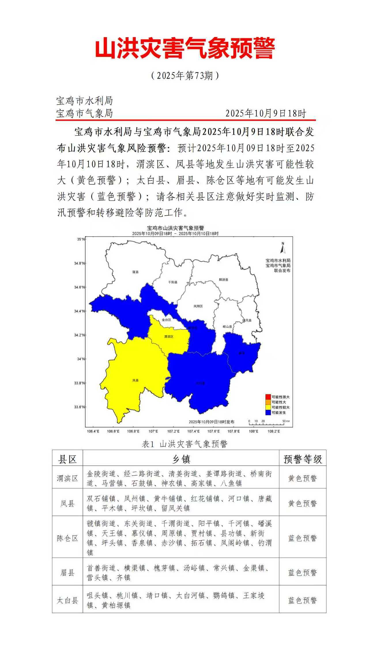 【宝鸡市气象局】宝鸡市水利局与宝鸡市气象局2025年10月9日18时联合发布山洪灾害气象风险预警:预计2025年10月09日18时至2025年10月10日18时,渭滨区、凤县等地发生山洪灾害可能性较大(黄色预警);太白县、眉县、陈仓区等地有可能发生山洪灾害(蓝色预警);请各相关县区注意做好实时监测、防汛预警和转移避险等防范工作。