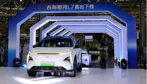 “银河L7”量产车下线后,与会嘉宾共同对该产品进行观摩。