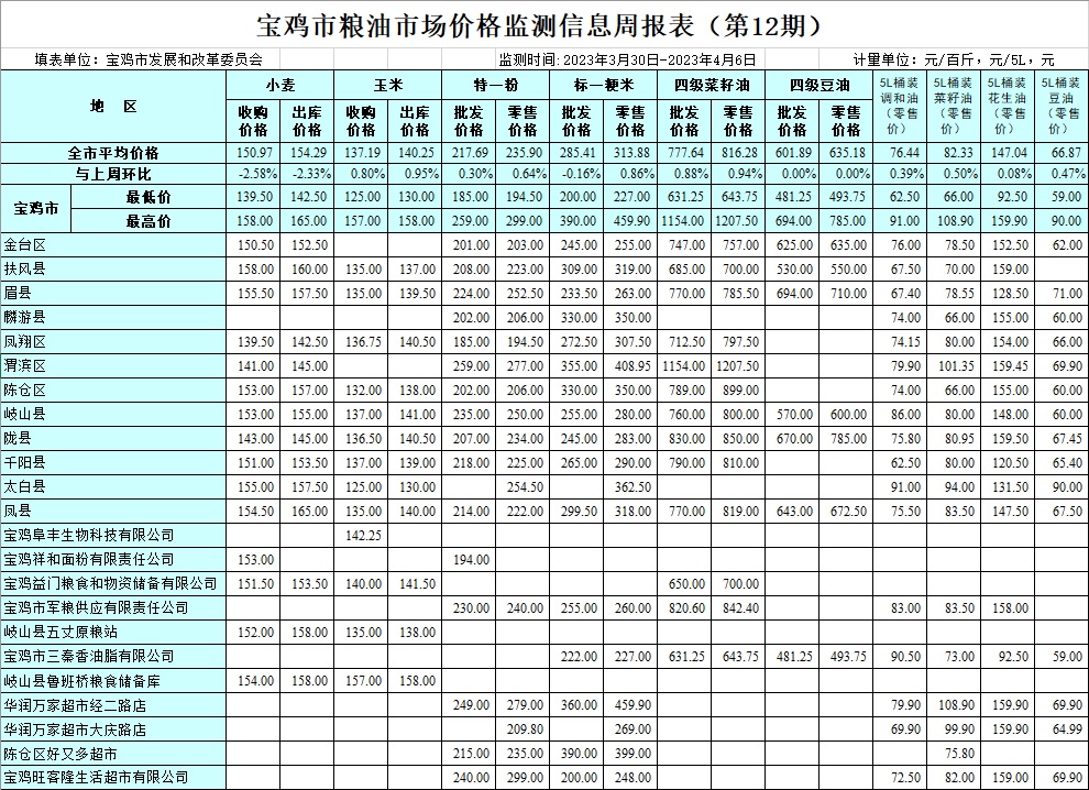 宝鸡市粮油市场价格监测信息周报表(第12期)