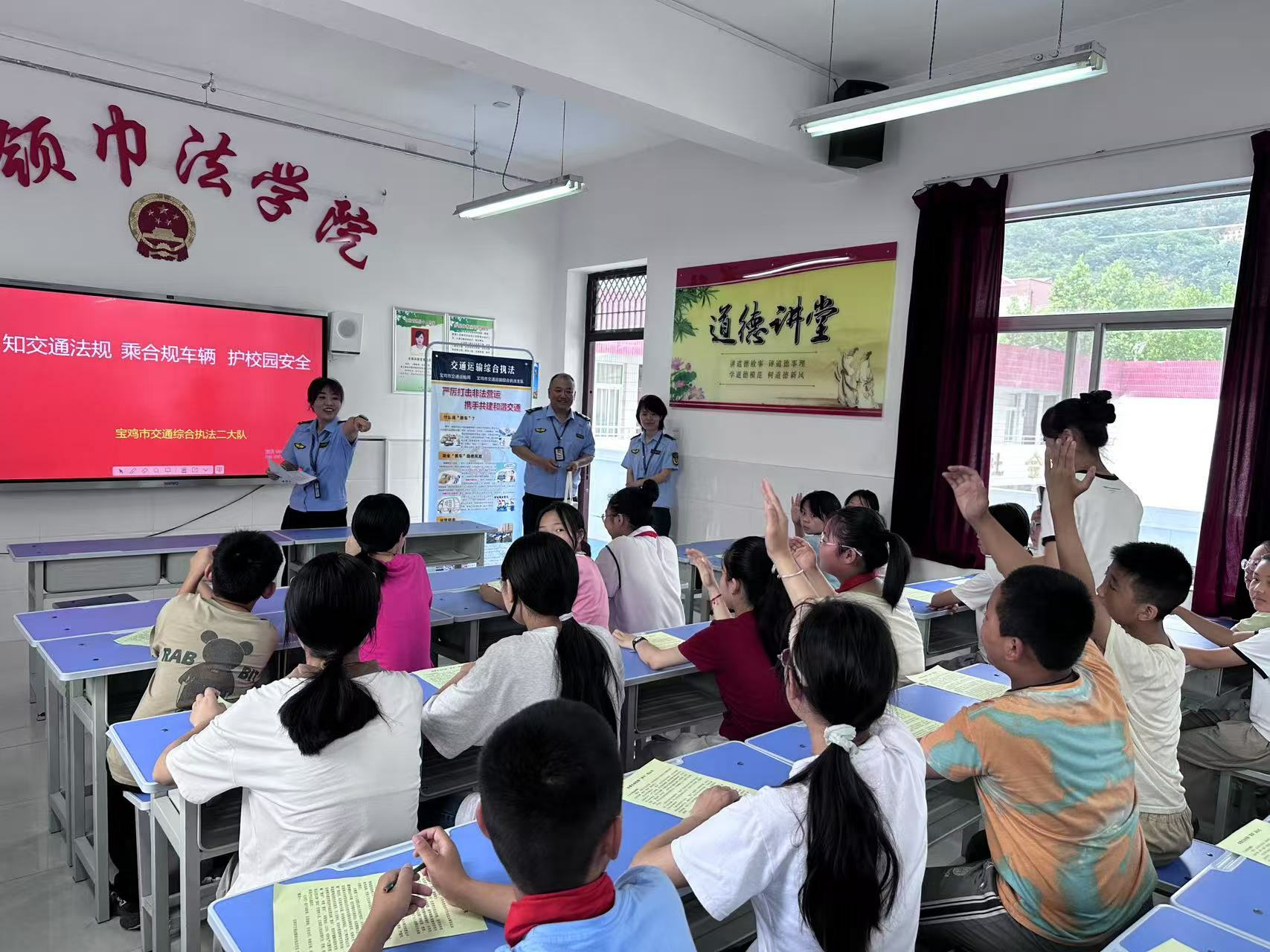 6月19日,二大队执法人员走进渭滨区神农镇益门堡小学,开展了"守护成长、拒乘黑车"主题宣传活动,为校园周边交通运输安全筑牢防线。