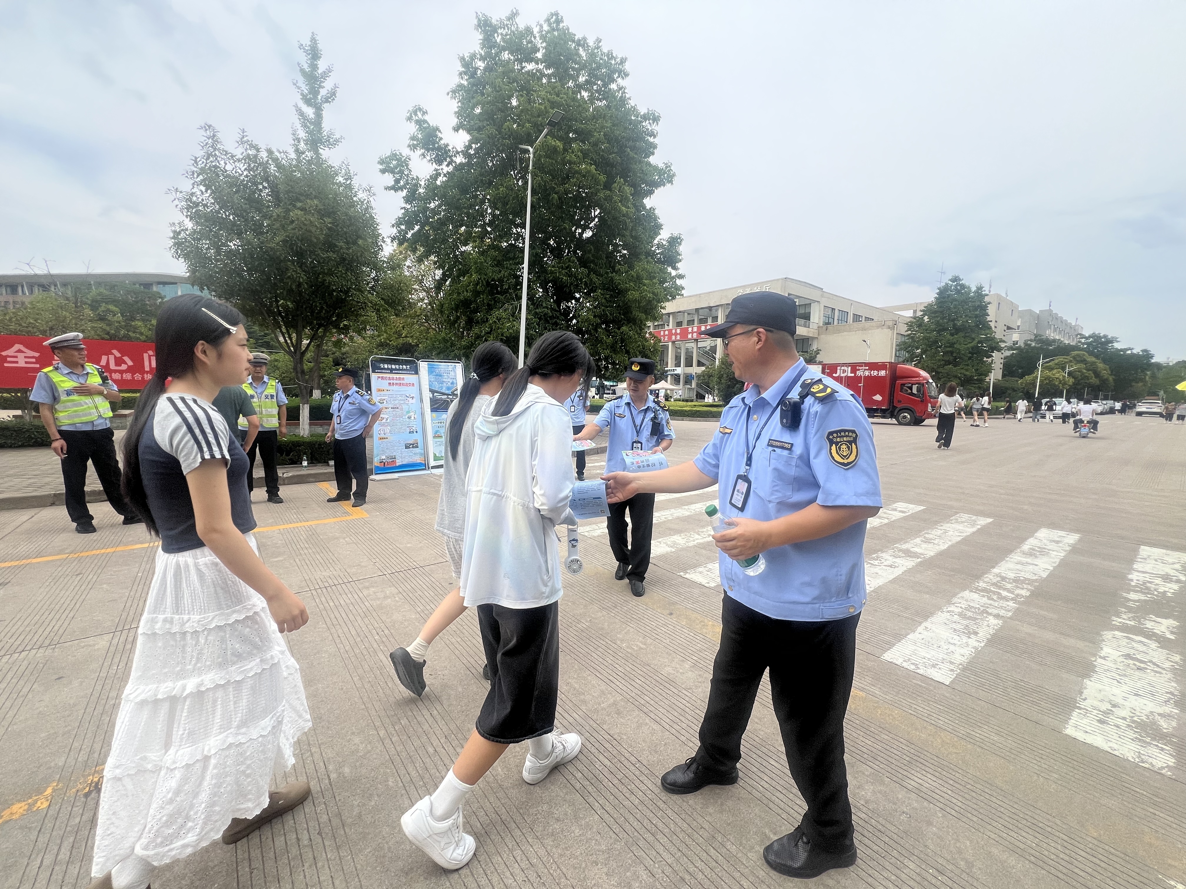 活动现场,工作人员精心布置宣传区域,通过悬挂醒目的宣传横幅、摆放图文并茂的宣传展板,营造浓厚的法治宣传氛围。执法人员与交警化身“普法讲师”,向师生发放《道路交通安全法规手册》《珍爱生命 远离黑车》等宣传资料,用通俗易懂的语言讲解与日常出行息息相关的法律知识。在互动宣讲环节,执法四大队执法人员则着重介绍“黑车”非法营运的违法性与危险性,通过展示非法营运车辆逃避监管、车况无保障、事故理赔难等问题,提醒师生务必选择正规交通工具出行,自觉抵制“黑车”。交警结合校园周边交通实际情况,针对学生上下学途中常见的交通违法行为,如闯红灯、随意横穿马路、乘坐超员车辆等,深入浅出地讲解其中的危害与法律后果。此次活动共发放宣传资料100余份,有效增强了师生的法治观念与安全意识,将法律知识和安全理念送到师生身边、驻进师生心间。