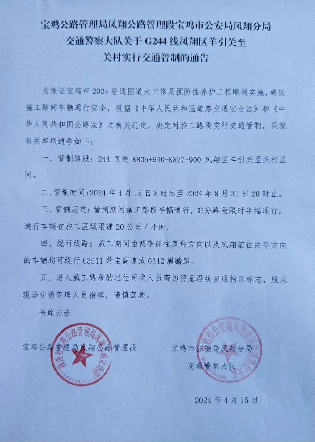 关于G244国道K805+640-K827+900凤翔区羊引关至关村区间道路施工路况信息