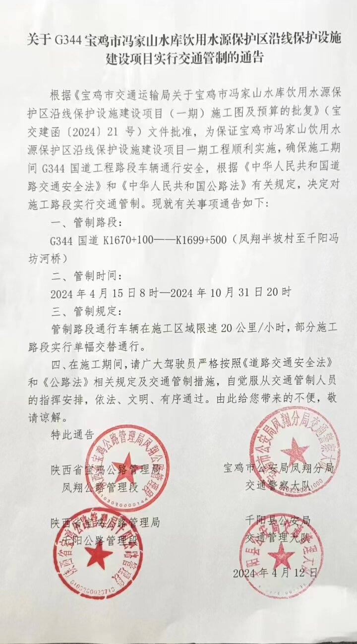 关于G344K1670+100-K1699+500(凤翔区半坡村至千阳冯坊河桥)实行交通管制的通告