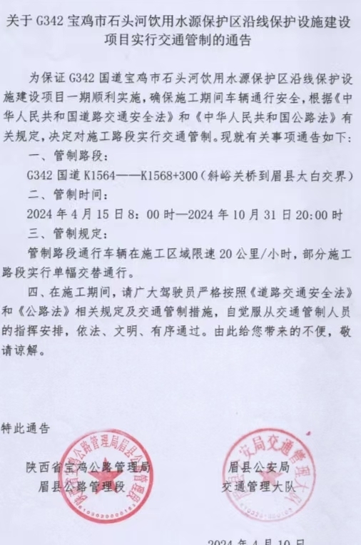 关于G342日凤线(眉县斜峪关桥到眉县太白交界)实行交通管制的通告