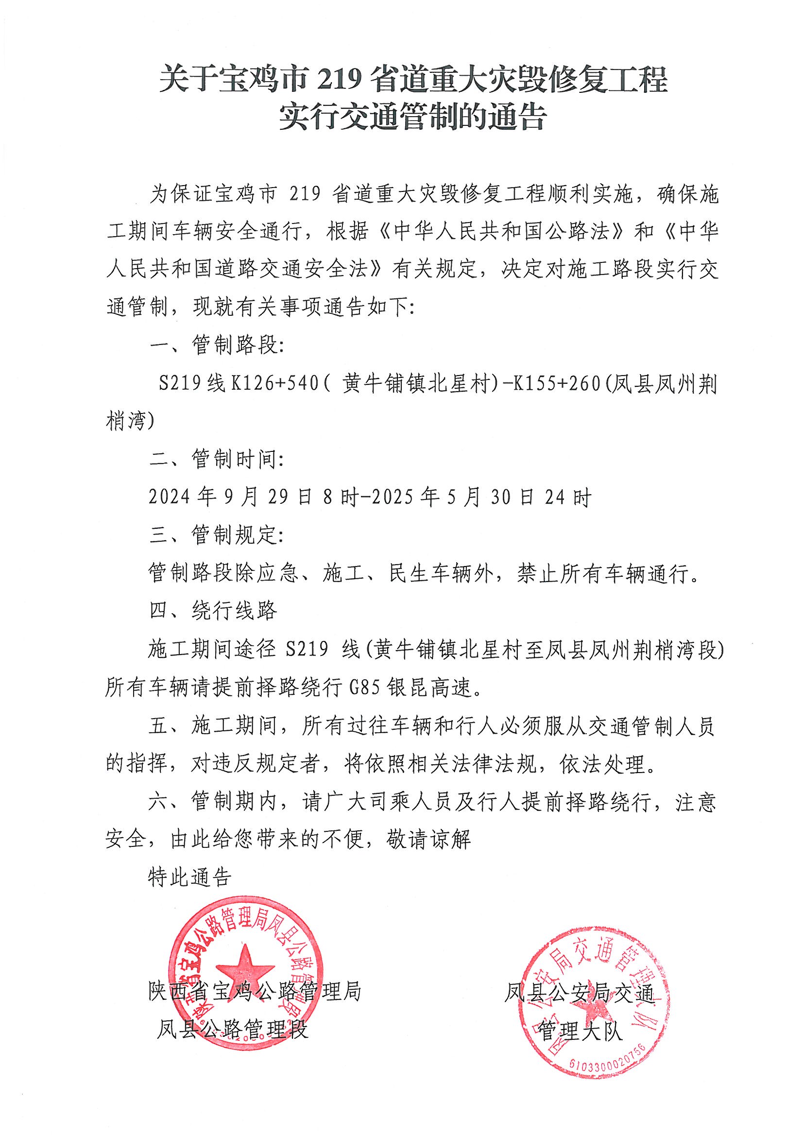 关于S219线K126+540(黄牛铺镇北星村)-K155+260(凤县凤州荆梢湾)施工交通管制路况信息