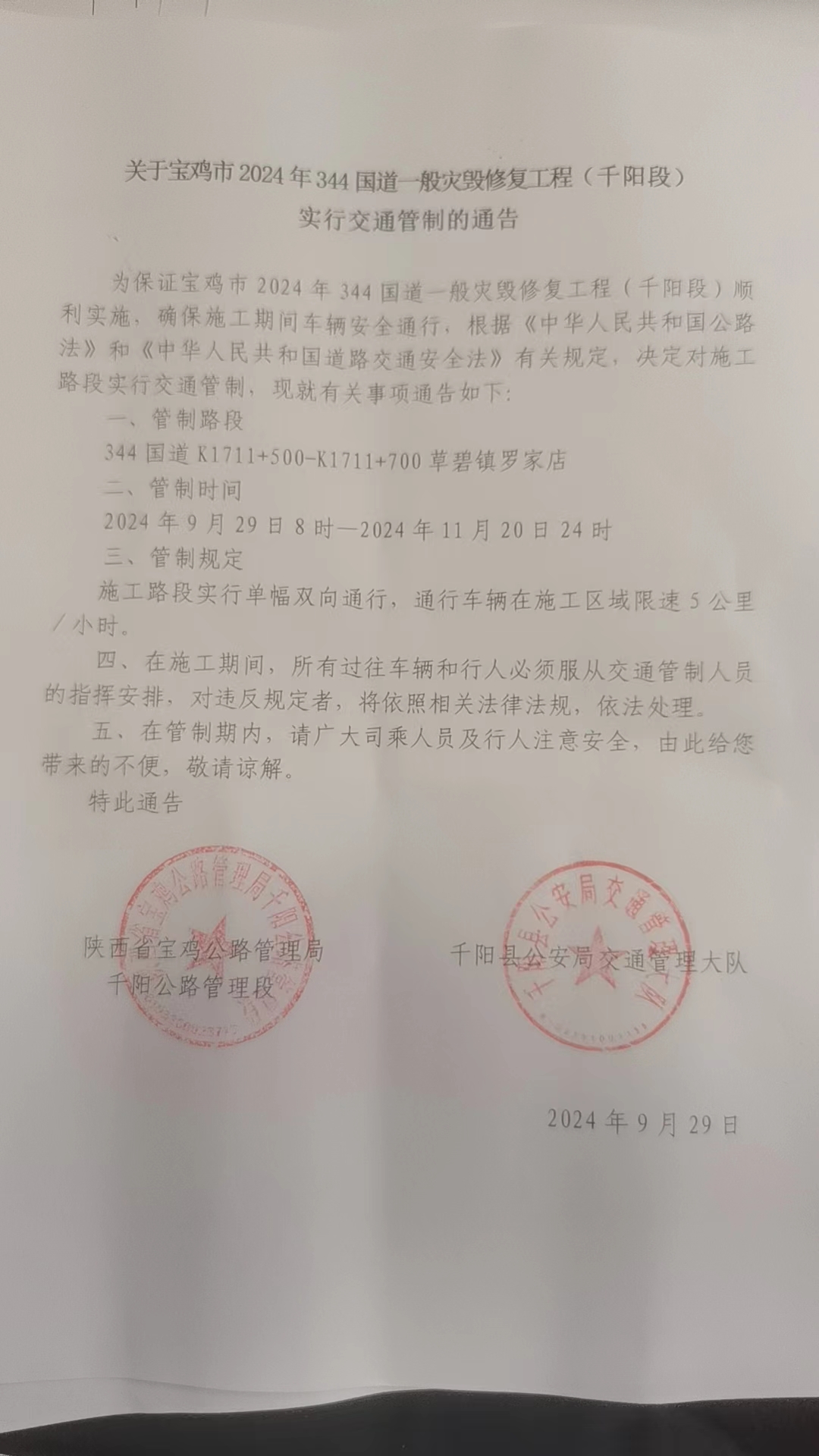 关于G344 国道K1711+500-K1711+700千阳县草碧镇罗家店施工交通管制路况信息