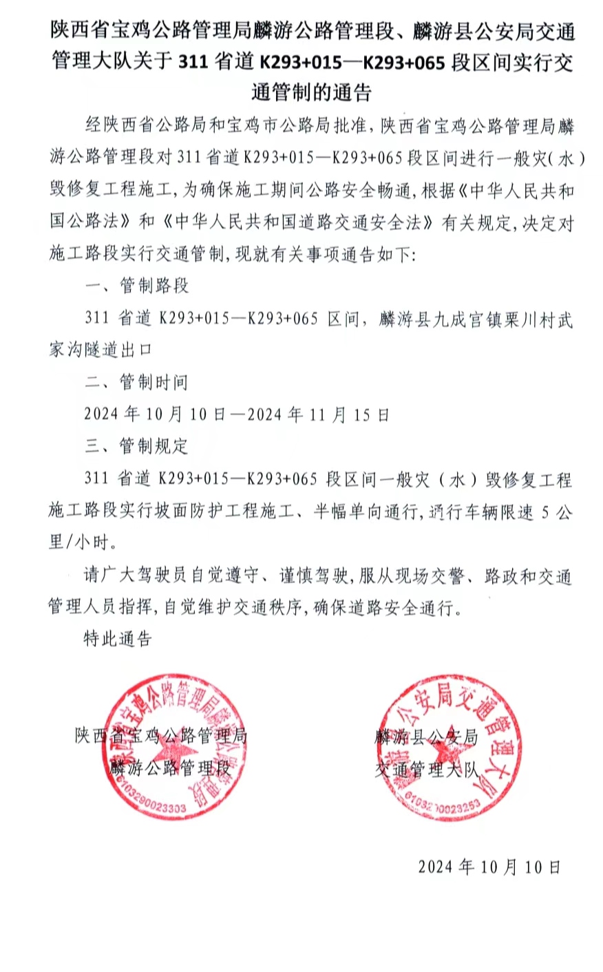 关于 311 省道K293+015-K293+065 段区间实行交通管制路况信息