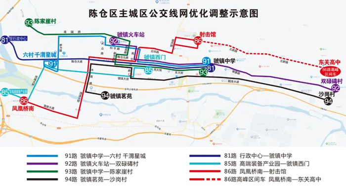 为促进陈仓区经济社会发展,依据宝鸡市公交专项规划,宝鸡市公共交通有限责任公司在广泛征求社会各界意见、建议的基础上,从今日起,在陈仓区主城区同时开通公交91、92、93、94路和86路高峰区间车,调整延伸81路、85路,陈仓区主城区公交与市区执行统一的服务标准、统一的运营模式、统一的票价政策,实现了一体化发展。