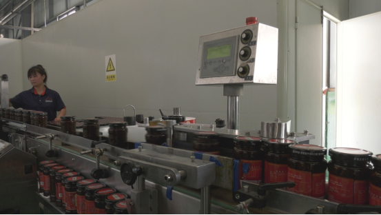 (经过精心加工的花椒芽菜酱从生产线传送出来,打包装盒)