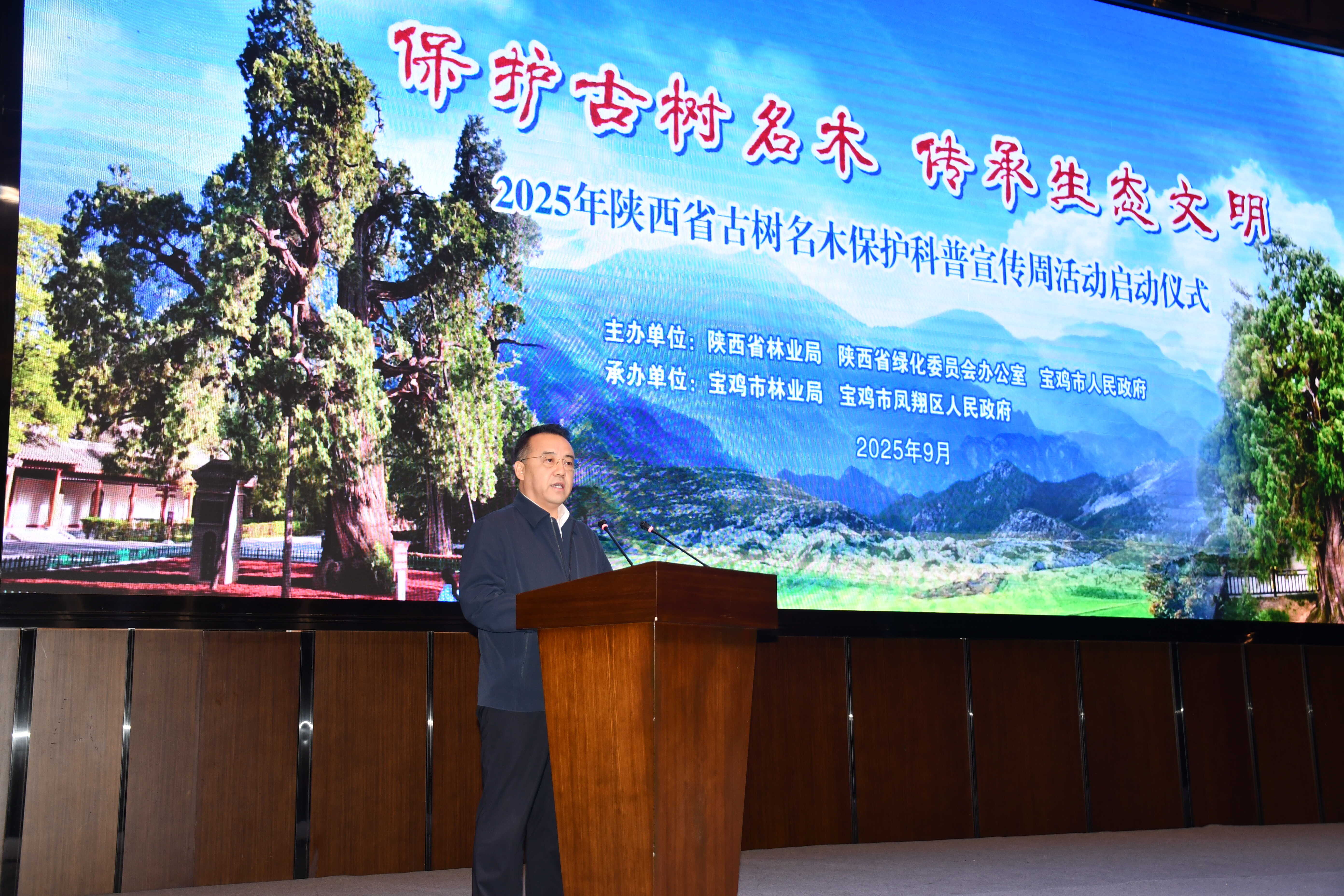 9月22日,2025年陕西省古树名木保护科普宣传周活动启动仪式在我市凤翔区举行。省林业局副局长薛恩东讲话并宣布活动启动,副市长李武发致辞,省林业局生态保护修复处处长孔绿玉、副处长王生银,省林业局科技法规处副处长刘蕾等参加活动。