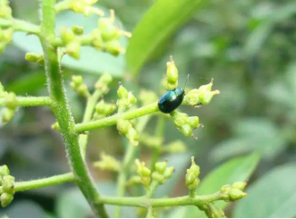 成虫蓝黑色并带有金属光泽,体长约 3-4 毫米,后足粗壮善跳;幼虫乳白色,体形细长(约 5-6 毫米),藏于土壤中啃食根系,剥开根部土壤可发现弯曲虫体。成虫取食嫩叶或叶柄,常从叶缘开始啃食,造成叶片缺刻或孔洞;幼虫蛀食果实内部,导致果实腐烂脱落,间接影响叶片营养供给。导致花椒树 “上病下伤”,树势衰弱。