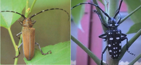 桑天牛黑褐色并密生黄棕色短毛,触角极长(接近体长);星天牛黑底白斑,鞘翅肩部有密集瘤突,“黑质而白章” 辨识度高;幼虫淡黄色、体肥圆柱形,藏于树干蛀道内,蛀道内可见黄褐色虫粪和黏液(俗称 “花椒油”)。桑天牛、星天牛都是 “大个头” 甲虫。幼虫藏在树干里蛀食木质部,2-3 年才完成一代,会导致枝条枯萎、树干中空,堪称花椒树的 “心腹之患”。