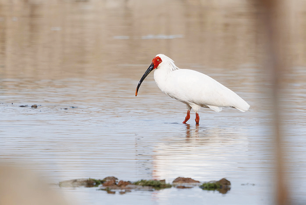 国家一级保护动物朱鹮和同为国家一级保护动物的黑鹳同时现身基地周边的湿地觅食。