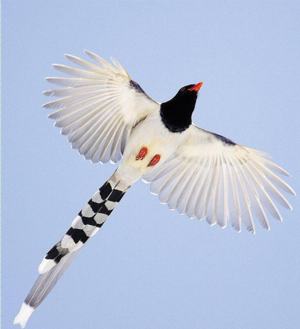 形态特征:红嘴蓝鹊是一种体态美丽的笼鸟,雌雄羽色相似。前额、头顶至后颈、颏、喉和上胸全为黑色,头顶至后颈各羽具白色、蓝白色或紫灰色羽端,且从头顶往后此端斑越来越扩大,形成一个从头顶至后颈,有时甚至到上背中央的大型块斑。背、肩、腰紫蓝灰色或灰蓝沾褐,尾上覆羽淡紫蓝色或淡蓝灰色、具黑色端斑和白色次端斑。雌雄鸟体表羽色近似。体背蓝紫色;尾羽颀长,尤以中央两枚更加突出,尾端白色,配上红嘴、红脚,益显仪态庄重,雍容华贵,又有长尾蓝鹊之称。
