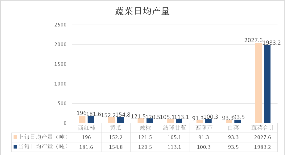 当前全市蔬菜在田面积25.34万亩,日均供应量约1983.2吨,与上年同期相比略有增长。主要集中在岐山、陈仓、扶风、凤翔、陇县等县区的蔬菜基地,当旬产量前六位的蔬菜依次为:西红柿、黄瓜、辣椒、结球甘蓝、西葫芦、白菜。其中,设施蔬菜主产品种为西红柿(日均产量181.6吨,产地收购价格2.1-2.4元/斤)、黄瓜(日均产量154.8吨,产地收购价格0.4-0.6元/斤)、辣椒(日均产量120.5吨,产地收购价格1.1-1.8元/斤)、西葫芦(日均产量100.3吨,产地收购价格0.4-0.6元/斤);露地蔬菜主产品种为结球甘蓝(日均产量113.1吨,产地收购价格0.4-0.6元/斤)、白菜(日均产量93.5吨,产地收购价格0.6-0.7元/斤)。