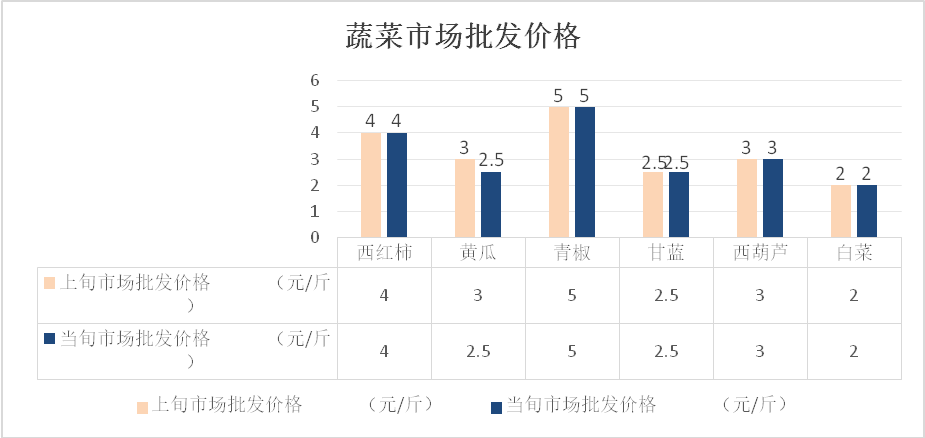 目前,各类蔬菜市场供应充足,整体价格保持稳定,部分蔬菜价格小幅下跌。据市价格监测中心监测数据,5月15日我市主要蔬菜品种批发价格:西红柿4元/斤,与5月7日持平;黄瓜2.5元/斤,比5月7日下跌16.7%;青椒5元/斤,与5月7日持平;甘蓝2.5元/斤,与5月7日持平;西葫芦3元/斤,与5月7日持平;白菜2元/斤,与5月7日持平。当前市场价格最高的蔬菜品种为豆王,市场零售价格8.8元/斤。