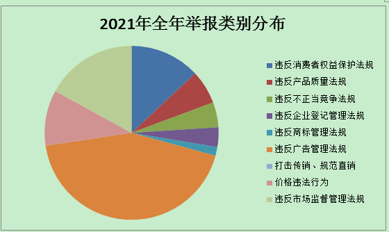 2021年全年数据显示举报主要集中在广告违法、价格违法、商标侵权违法、房地产及相关行业违法行为等。一是广告违法行为凸显:反映问题主要集中在广告涉嫌虚假宣传或夸大宣传,使用“第一品牌”、“最优”、“首选”等绝对化用语,夸大产品效果,在药品、保健品、医疗器械等广告中尤为明显,个别商家利用网络、店堂彩页进行虚假宣传等举报呈上升态势,同时各类网络购物平台在销售宣传中存在功能、价格标示、产品认证、成份标记和专利的虚假宣传违法行为。二是价格违法行为:价格违法行为:主要涉及商家未明码标价,或支付的商品、服务价格高而引发的消费纠纷,同时物业违反相关规定乱收停车费、水电费、物业管理费的举报呈现上升趋势;再之道路停车、有违反明码标价规定的价格违法行为;不执行政府指导价、政府定价的行为及法律、行政法规禁止的其他不正当价格违法行为等。三是商标侵权等违法行为:主要存在商标被冒用、假冒他人专利违法行为和专利标识使用不规范的违法行为。四是房地产及相关行业投诉量持续增加主要表现在:房产交房时与广告宣称不一致。房产促销活动不规范,在房地产促销中,采取意向定金、打折优惠等方式,促使消费者在没有全面知悉合同具体内容的情况下,就草率签字,极易引发涉及定金退还方面的合同纠纷。