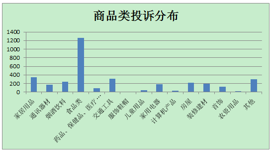 商品类投诉4215件,占总投诉的40.7%,服务类投诉3800件,占总投诉的36.7%。其中食品类、交通工具、家居用品类投诉排名关前三位(详见下图):