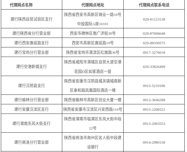 建行代理网点地址联系电话表格