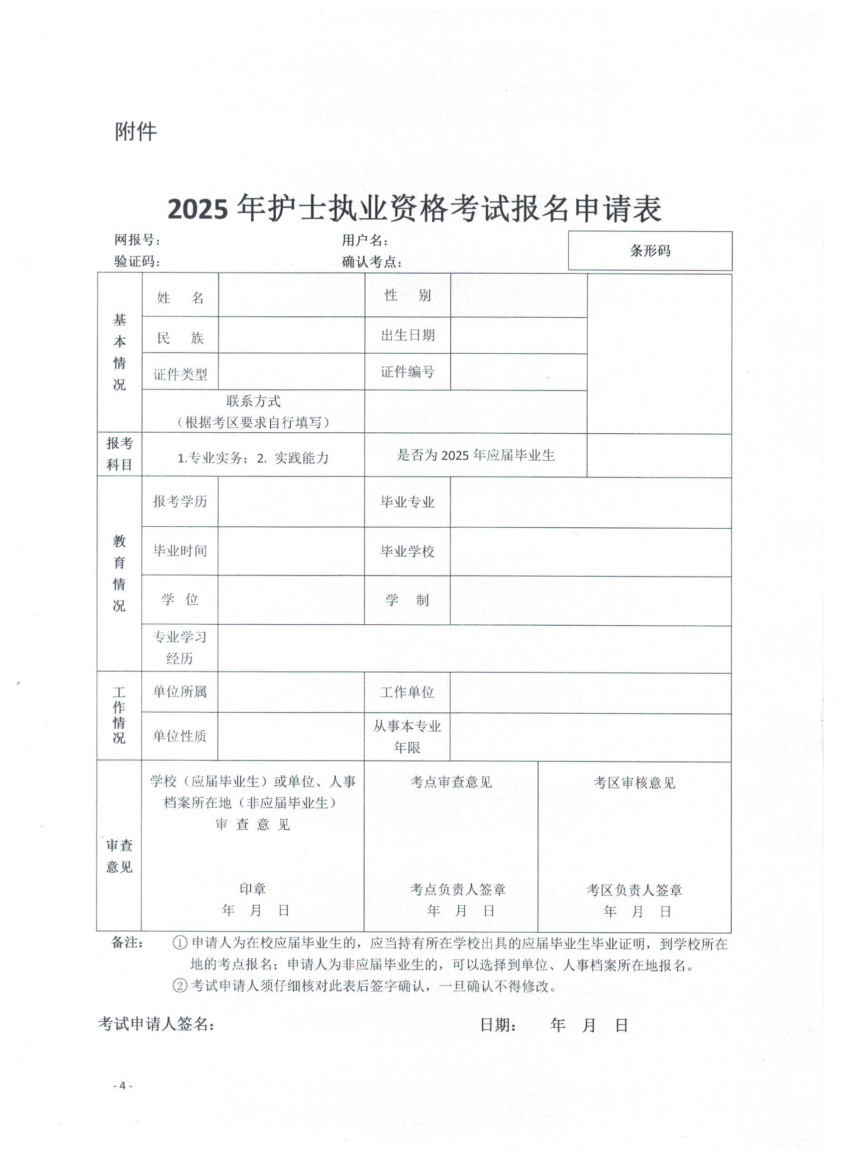 (一)网上预报名:2024年12月3日至12月16日,考生自行登录国家卫生健康委人才交流服务中心(原中国卫生人才网www.21wecan.com)进行网上预报名,并打印《2025年护士执业资格考试报名申请表》。