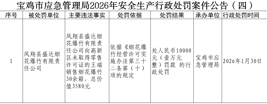 宝鸡市应急管理局2026年安全生产行政处罚案件公告(四)
