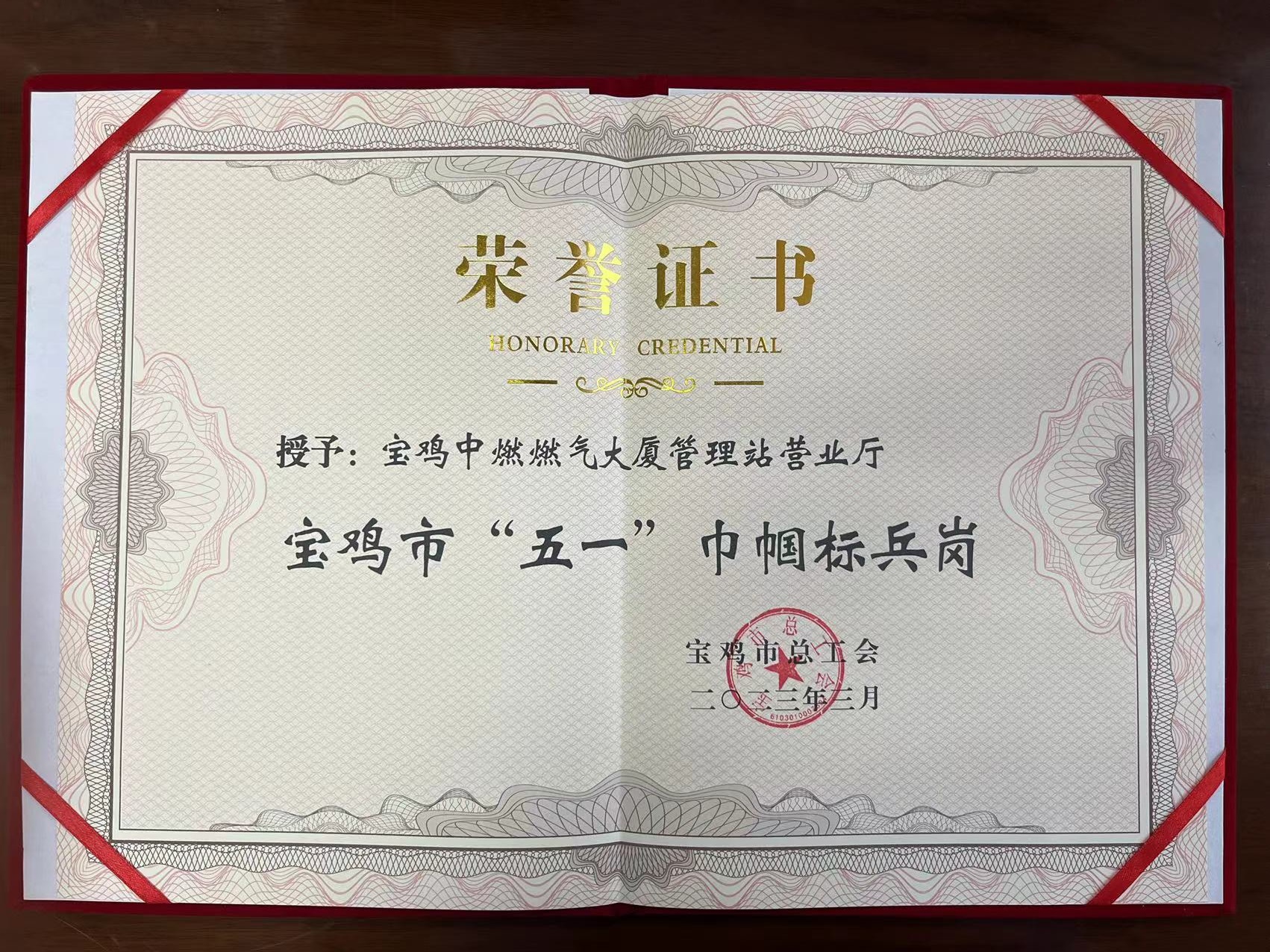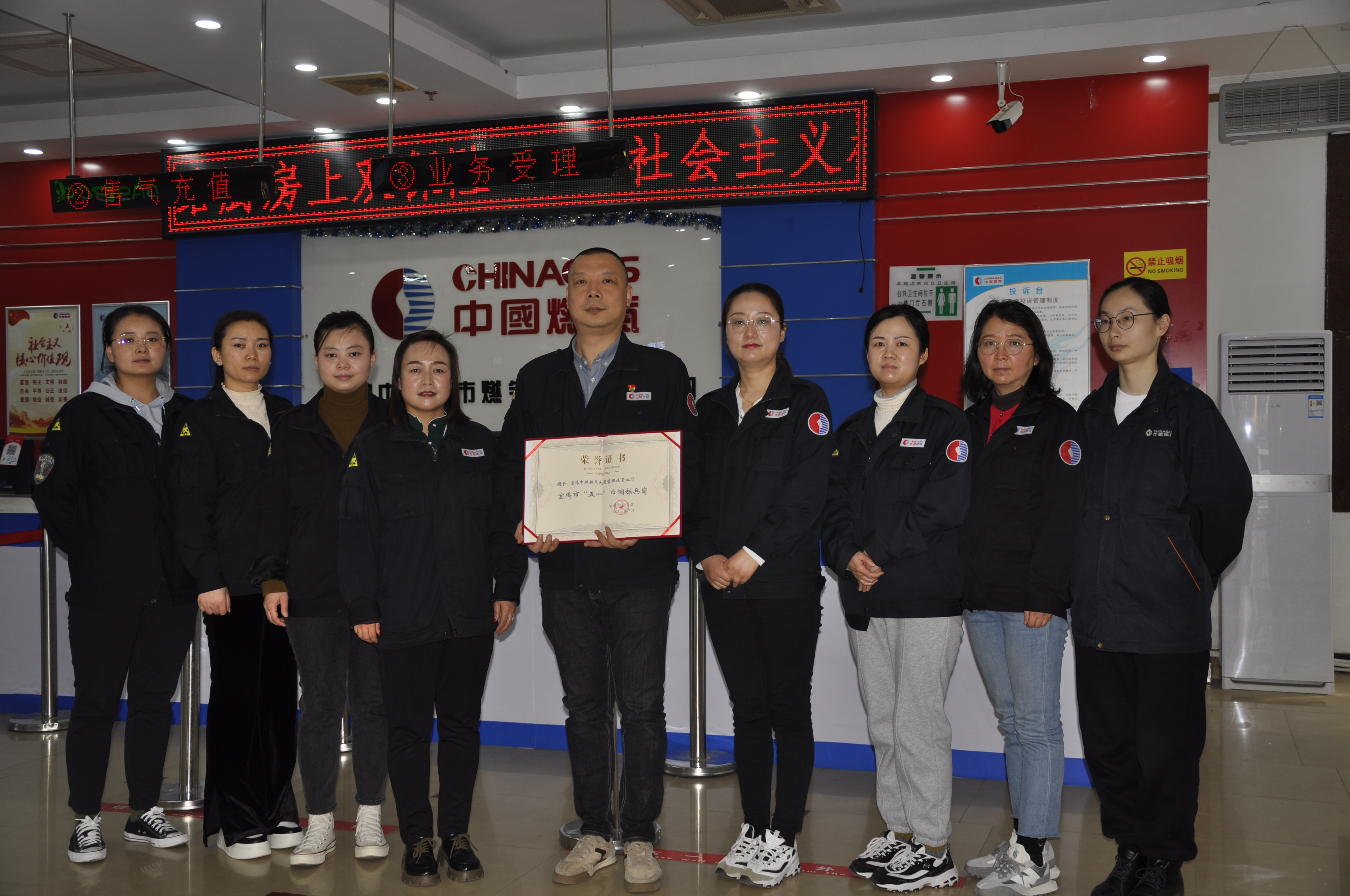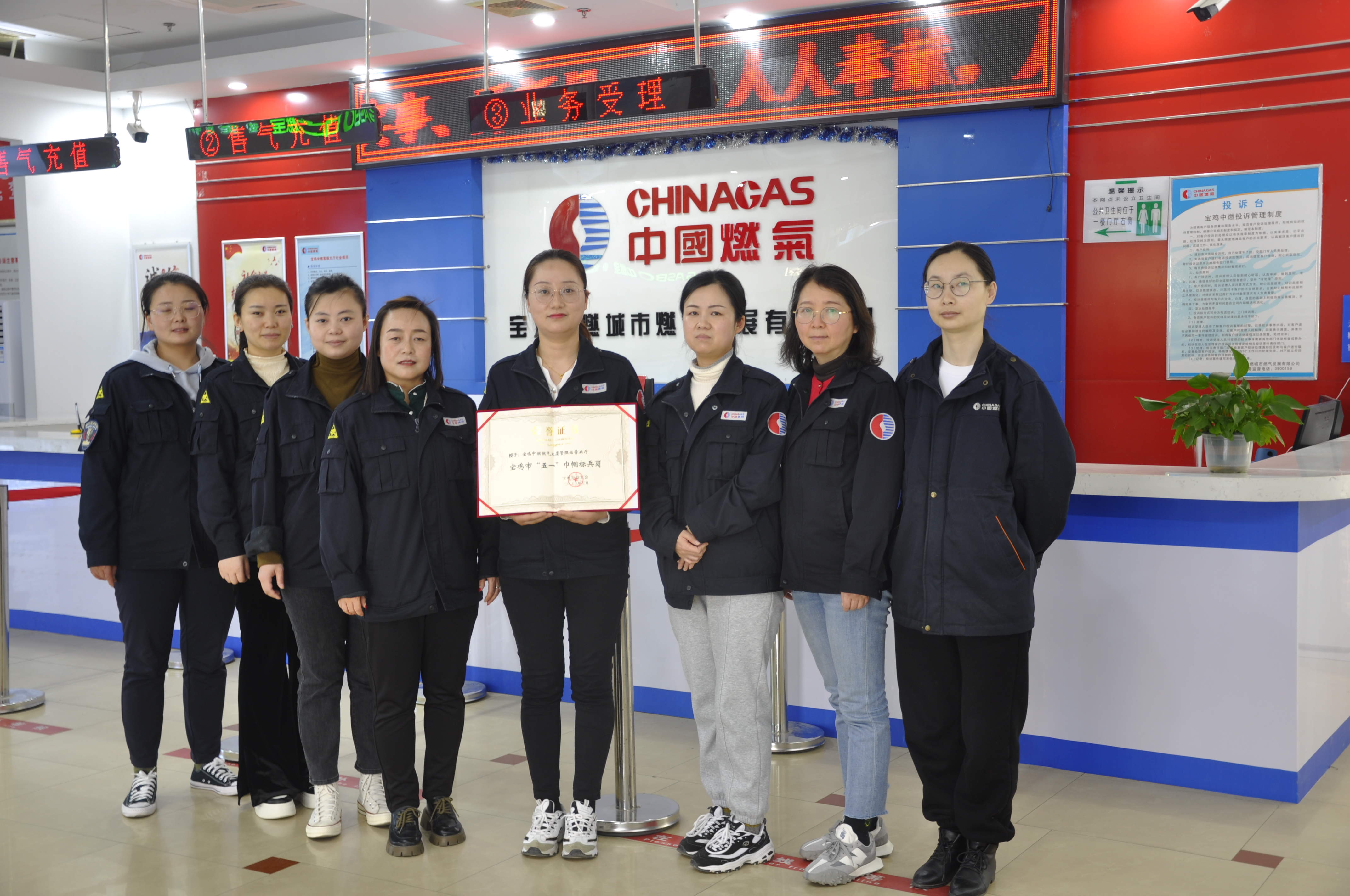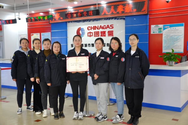 近日,宝鸡中燃公司燃气大厦营业厅被宝鸡市总工会授予“宝鸡市五一巾帼标兵岗”称号。