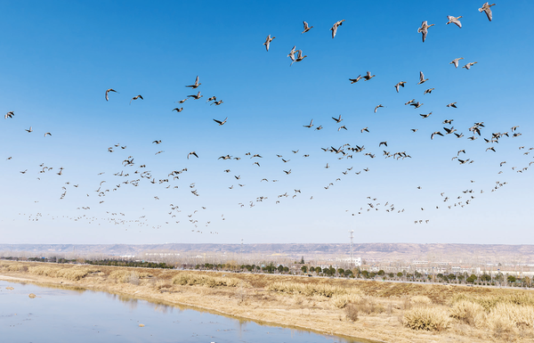 1月10日,渭河宝鸡市区段上演了一场震撼的自然奇观,上千只大雁组成的迁徙大军在此过境。