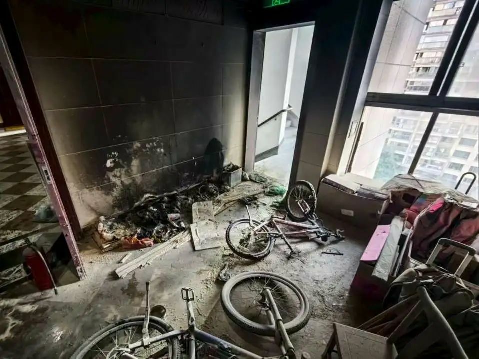 “我当时在屋里听到‘嘭’一声响,不知道门口什么东西炸了,冲出门一看,就看到楼道里的杂物烧起来了,我急忙从家里拿灭火器去灭火,还好当时的火不是很大,马上就被灭掉了。”户主心有余悸。
