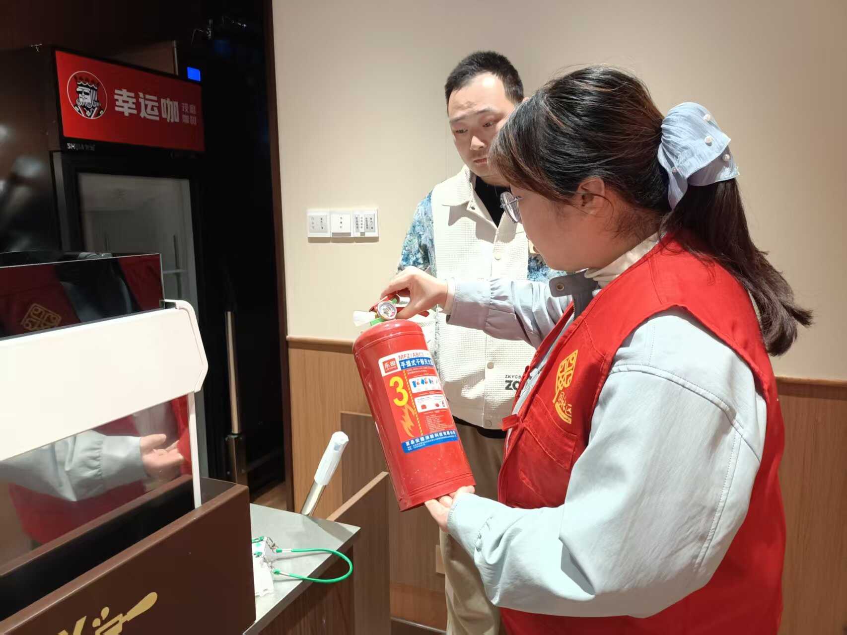 在便利店、网吧等场所,志愿者们聚焦货物堆放规范、电气设备安全等高频问题,细致检查消防设施是否被遮挡、插线板是否过载使用,对隐患逐一指出并协助整改;同时向经营者反复叮嘱 “国庆客流增多,灭火器需放在显眼位置,员工务必熟练掌握使用方法”,还手把手指导操作各类消防安全设备,确保突发情况能快速响应。“以前没意识到这些细节的重要性,多亏志愿者上门提醒,这下经营更安心了!” 不少经营者由衷感慨。