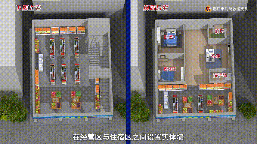 防火“硬隔离”是指通过物理防火分隔手段,将住宿区与生产、经营、储存等区域严格分隔,其核心作用是:在一定时间内,将火势和烟气控制在起火空间内,防止向其他区域蔓延,确保人员有足够时间安全逃生。简单说,实现“火不上楼、烟不蔓延、人能逃生”。常见的防火“硬隔离”手段有设置防火墙、防火门、防火卷帘等。