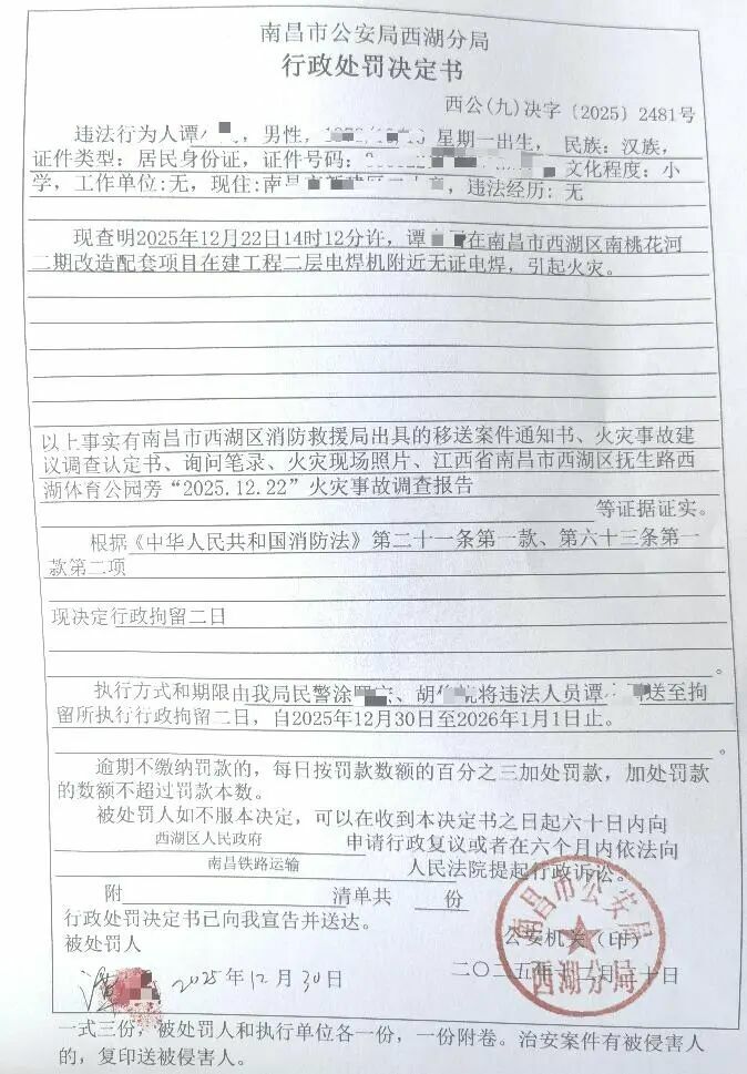 消防员迅速赶赴现场处置,经核查确认,此次火情系当事人庞某无证违规操作气割机进行动火作业所致。执法人员第一时间对违法现场进行拍照取证,约谈相关责任人并开展笔录调查,随后将案件依法移送公安机关处理。经查实,庞某在未取得特种作业操作证的情况下,擅自在厂房内实施明火作业,其行为已构成违法使用明火作业。公安机关依据相关法律法规,对违法行为人庞某作出行政拘留两日的处罚。
