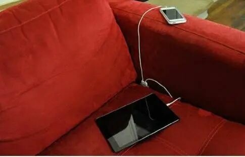 一部在沙发上充电的手机