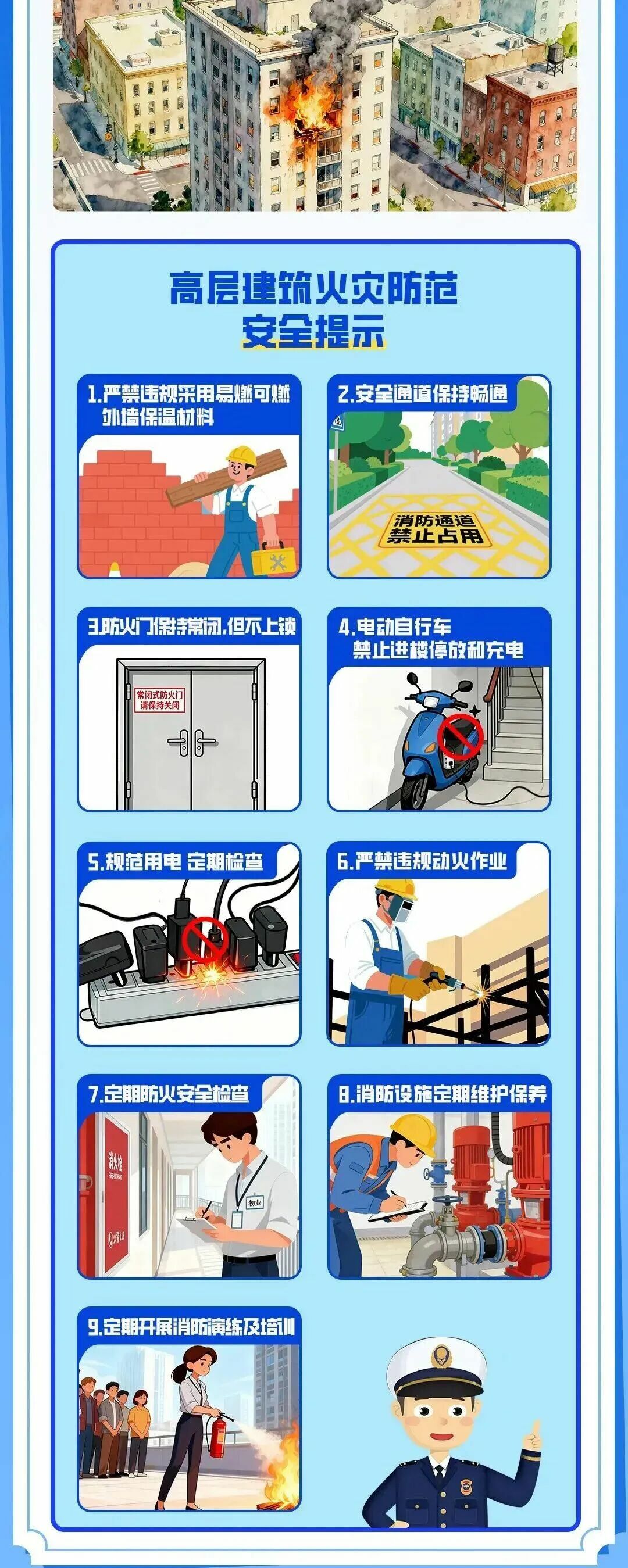 高层建筑具有结构复杂、人员密集、火灾荷载大等特点。一旦发生火灾,火势蔓延迅速,易形成立体燃烧;疏散逃生困难,人员撤离时间长;火灾扑救难度大,对消防装备要求高。 近年来,电动自行车违规充电、外墙保温材料易燃、消防通道堵塞等问题尤为突出,成为高层建筑重大火灾风险源。