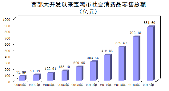 消费市场走向繁荣。20年来,商贸模式快速变化,消费市场走向繁荣,新业态、新模式快速成长,网络营销异军突起,新型多元化销售网络迅速形成。开元商城、高新天下汇、新东岭城市综合体等综合性购物中心先后建成运营,宝鸡的购物环境不断改善,商业中心不断拓展,商贸水平不断提升,今天的宝鸡已形成消费市场遍布城乡、流通网络四通八达、名优品牌应有尽有、消费内容丰富多元的商贸流通格局。2018年,全市社会消费品零售总额达864.60亿元,是1999年的13.3倍,期间年均增长14.6%。