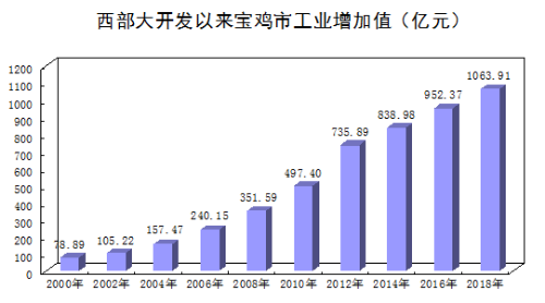 工业实力突飞猛进。1999年,全市工业增加值占地区生产总值比重41.9%,2018年达到47.0%,占比提高5.1百分点。2018年末,宝鸡规模以上工业企业达到742户,规模以下工业企业5500余户,全年实现工业增加值1063.91亿元,达到1999年的14.2倍,期间年均增长14.7%;规模以上工业总产值达到3454.27亿元,达到1999年的25.5倍,年均增长23.8%。