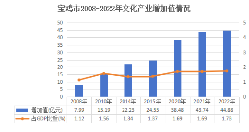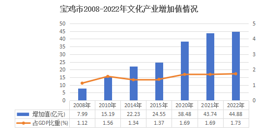 文化产业增加值持续攀升。自2008年以来全市文化产业增加值呈稳定增长态势。2021年全市文化产业增加值突破40亿元大关,达到43.74亿元,占GDP比重为1.69%。2022年,全市文化产业实现增加值44.88亿元,占GDP比重为1.73%,较2008年提高了0.61个百分点,文化产业增加值总量较2008年增加了36.89亿元,年均增长13.1%。